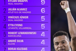 西甲射手榜:姆巴佩9球居首 阿尔瓦雷斯第二、维尼修斯第三