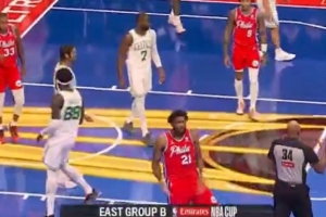 老惯犯了!恩比德滞空跳投打进2+1 面对观众席做不雅庆祝动作